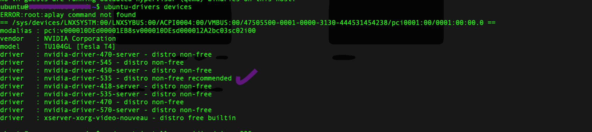 After install of sudo apt install ubuntu-drivers-common, you can query for recommended drivers as,